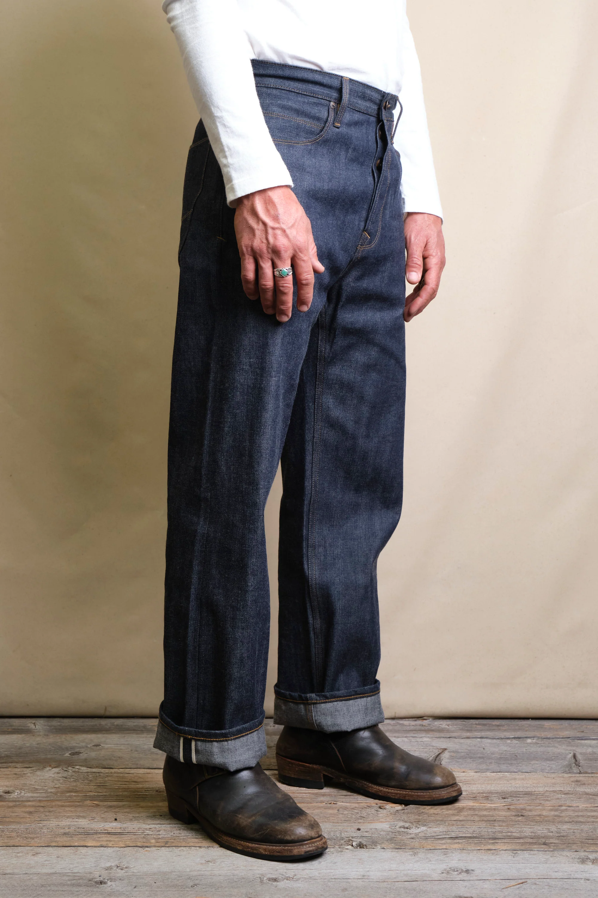 - Custom 11 ounce reproduction selvedge denim from Japan