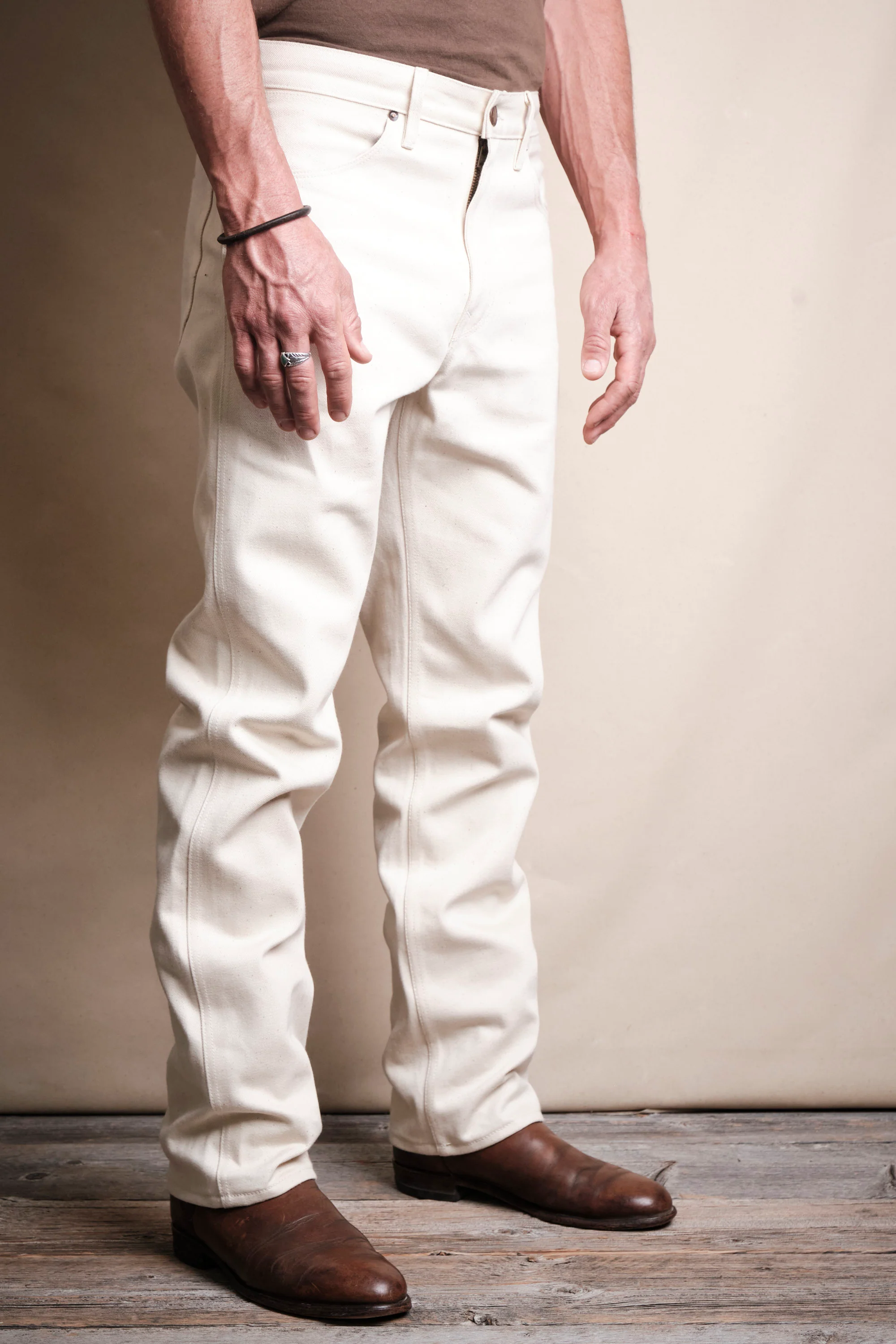 - 14 ounce ecru denim from Japan